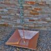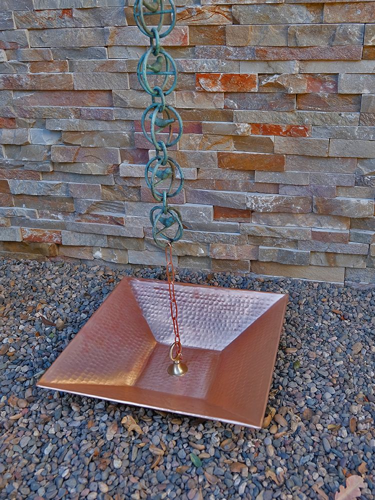 Just like our Hammered Copper Dish, but in a square shape with shallow angles. This Square Hammered Copper Dish includes our patented brass loop assembly and a short length of light copper link chain. This is ideal for securing your rain chain. (Beware of loop imitations that easily break!). Each dish is hand-crafted so dimensions, color and surface texture may vary.