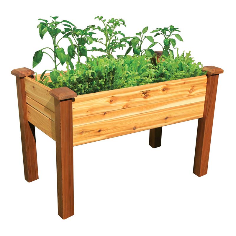 This Elevated Garden Bed is excellent for small patios, decks, condos, and apartments. It will work great anywhere you’d like to grow vegetables, herbs, or flowers. The Elevated Garden Bed eliminates bending over while gardening and is perfect for gardeners with mobility and back strain issues. Constructed of 100% Western Red Cedar and handcrafted in the USA. Available Unfinished. It comes in a boxed kit with easy-to-follow Tool-FREE instructions. These planters set up in five minutes. Place the custom-cut piece of landscape fabric in the bottom of the bed, add soil of your choice, then you’re ready to plant vegetables, herbs, or flowers!