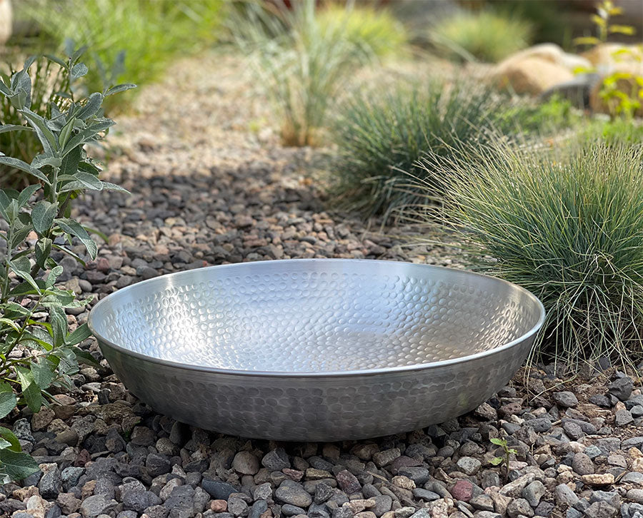 This Aluminum Dish is designed to be useful for many purposes! Fill it with pebbles or plant it with ground cover for a gorgeous effect! Use it indoors as a container, fruit display, or whatever else you can think of. Just like our Hand Hammered Copper Dish, but made of pure aluminum.